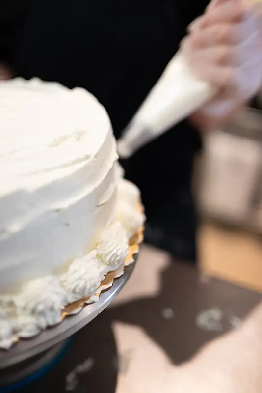 Moist Chocolate Cake layered with Sweet Coconut-Pecan Frosting, topped with Chocolate Icing. Available by the Slice, 10″ Single Layer, or 6″ Double Layer Cake.